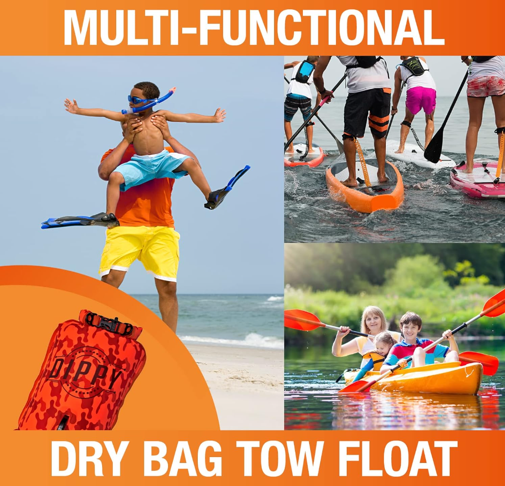 Safety First: Our tow float/dry bag, equipped with a built-in whistle, attracts attention and enhances your safety in the water.