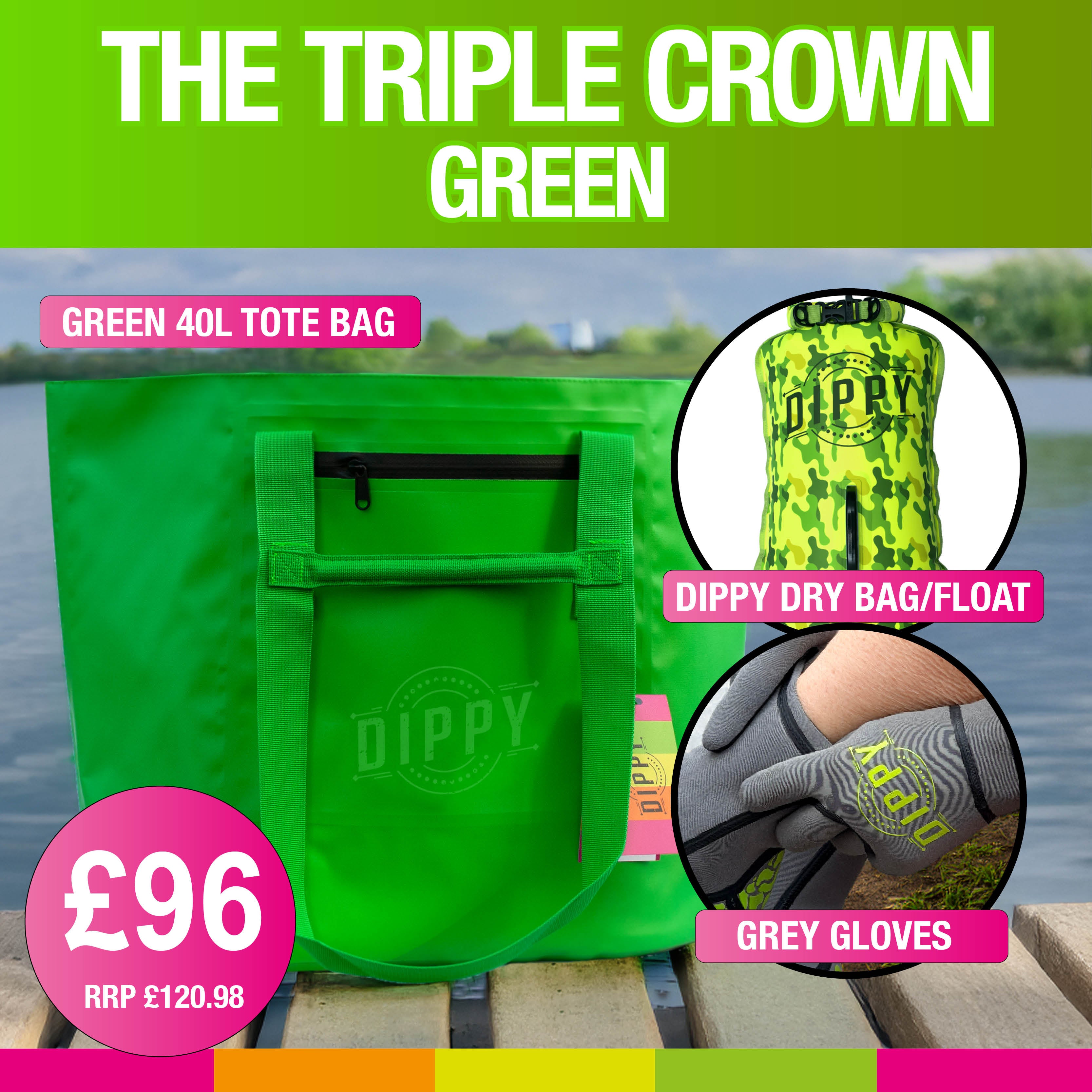 Green Tote Bag, Yellow/Green Dippy Tow Float/Dry Bag and Grey Neoprene Gloves.