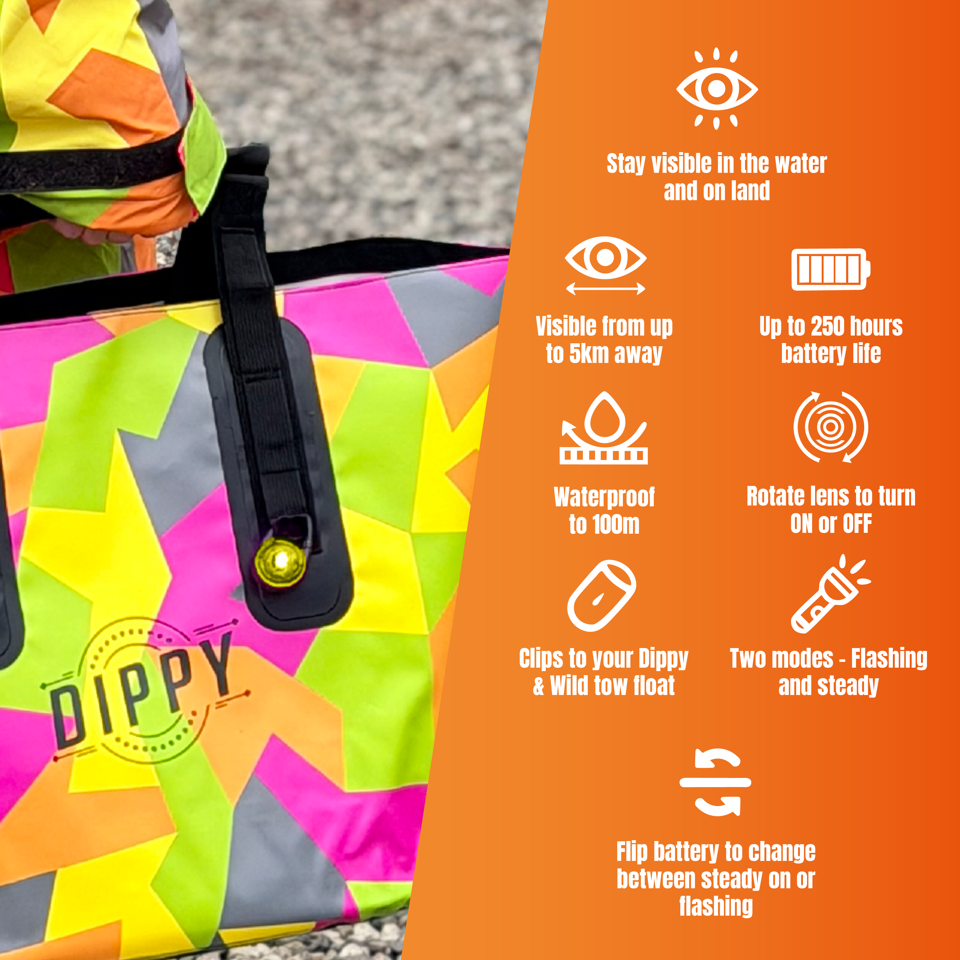 - Versatile Clip: Attaches to dry bags, tow floats, rucksacks, gear, or even dogs.